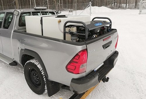 The Hilltip Jet-it™ mobile pressure washer with a water tank is designed for pickups, trailers, tractors, and similar equipment. The hot water pressure washer’s broad application areas includes easy washing and spraying of yards, graffiti, gardens, pavements, stairs, roofs, machines, facilities, and more. It includes a convenient 20-metre hose reel and an electric start.