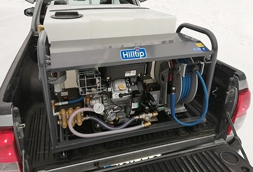 The Hilltip Jet-it™ mobile pressure washer with a water tank is designed for pickups, trailers, tractors, and similar equipment. The hot water pressure washer’s broad application areas includes easy washing and spraying of yards, graffiti, gardens, pavements, stairs, roofs, machines, facilities, and more. It includes a convenient 20-metre hose reel and an electric start.