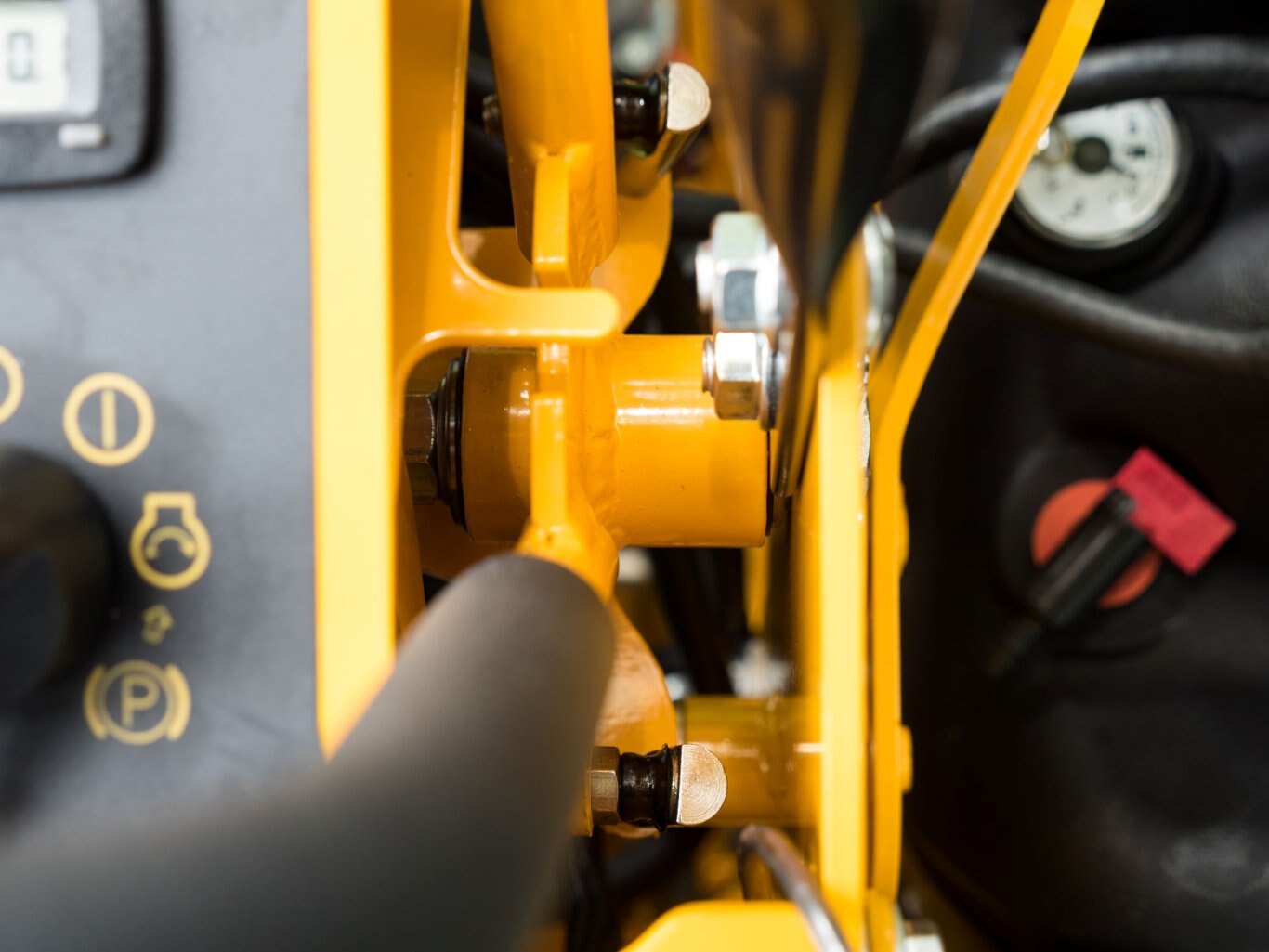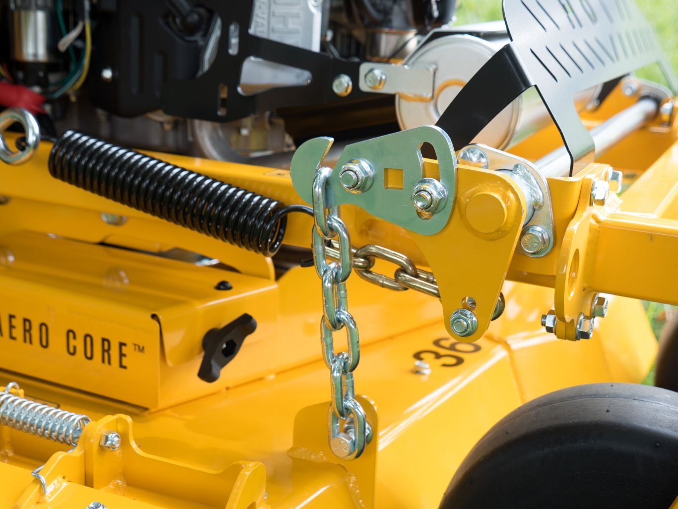 Stander ZK, X, and Intensity models have a push button deck lift. The patented push button design allows us to install strong springs to make it easy to lift the deck, while the push button lock keeps the deck from bouncing.